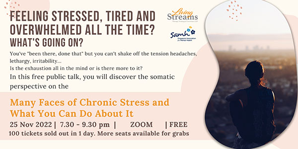 More than 160 signed up for the free public talk and learnt some handles on how to manage stress with somatic experiencing. A recording of the session was shared to the participants after the event. Thanks to SAMH for their support in the publicity.